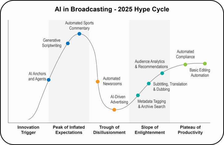 Artificial intelligence continues to dominate the conversation in broadcasting, with promises of automated anchors, smarter advertising, and more efficient production. Yet, as with every major technological breakthrough, AI is progressing along the familiar hype cycle: a surge of high expectations, a phase of reassessment, and eventually a climb toward productive, everyday use.