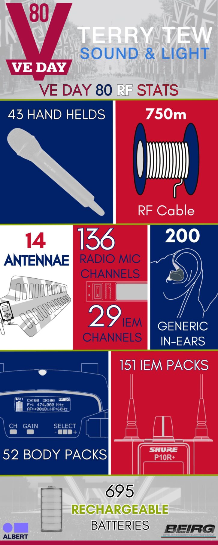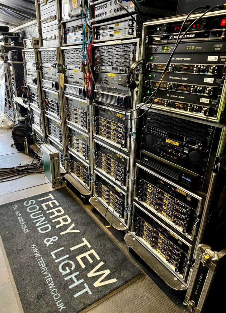 Antennas were placed in front of the stage in Horseguards’ Parade, sitting just below the stage to keep them out of shot, with more sat backstage so the crew could ensure everything was working OK before the transmitter went out on stage. “A couple at the end of the fibre run, again out of shot, and the IEM antennae were cleverly hidden on stage so that even I had to squint to see them.”